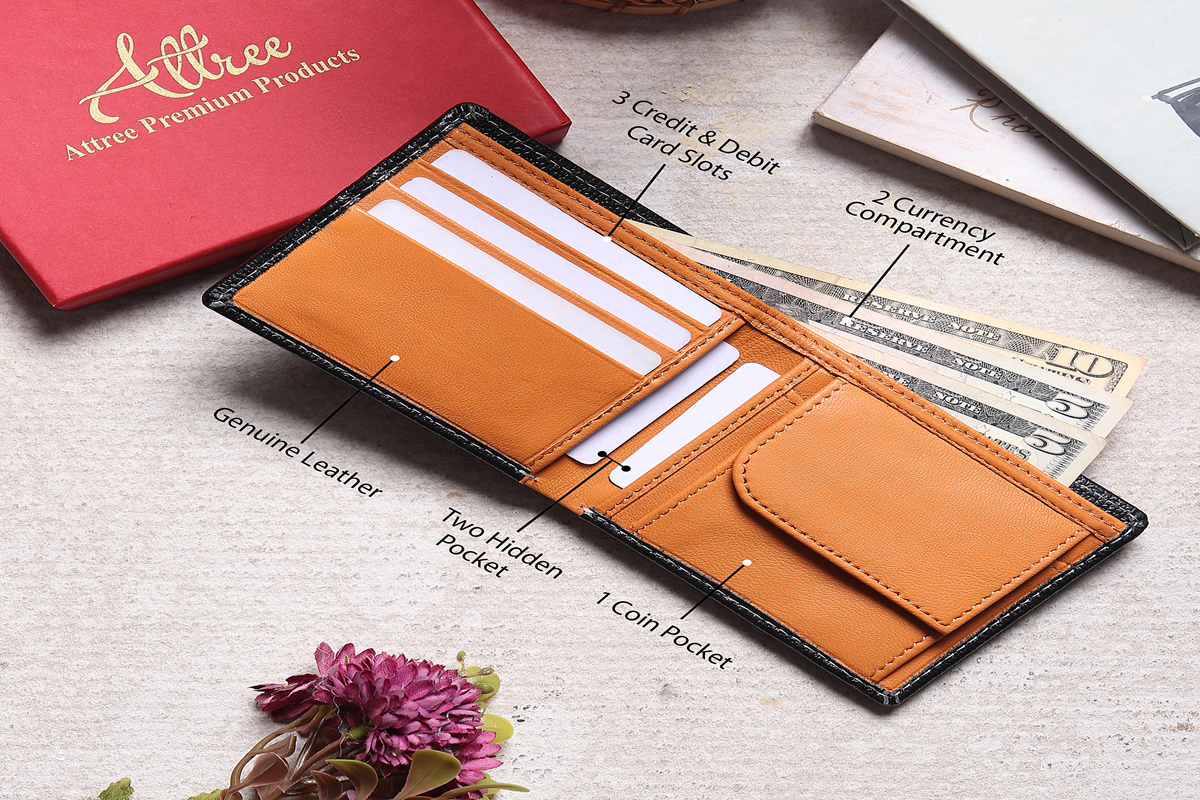 This image highlights the key functional features of the Attree premium leather wallet, designed for security, organization, and everyday convenience.