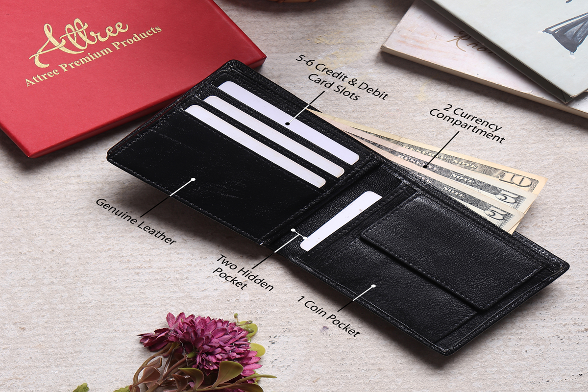 The wallet features multiple smartly organized compartments, including a dedicated coin pocket, spacious cash compartments for bills, and three credit/debit card slots for easy access to your essential cards. Additionally, it includes two hidden pockets, perfect for storing extra cards, receipts, or important documents discreetly.
