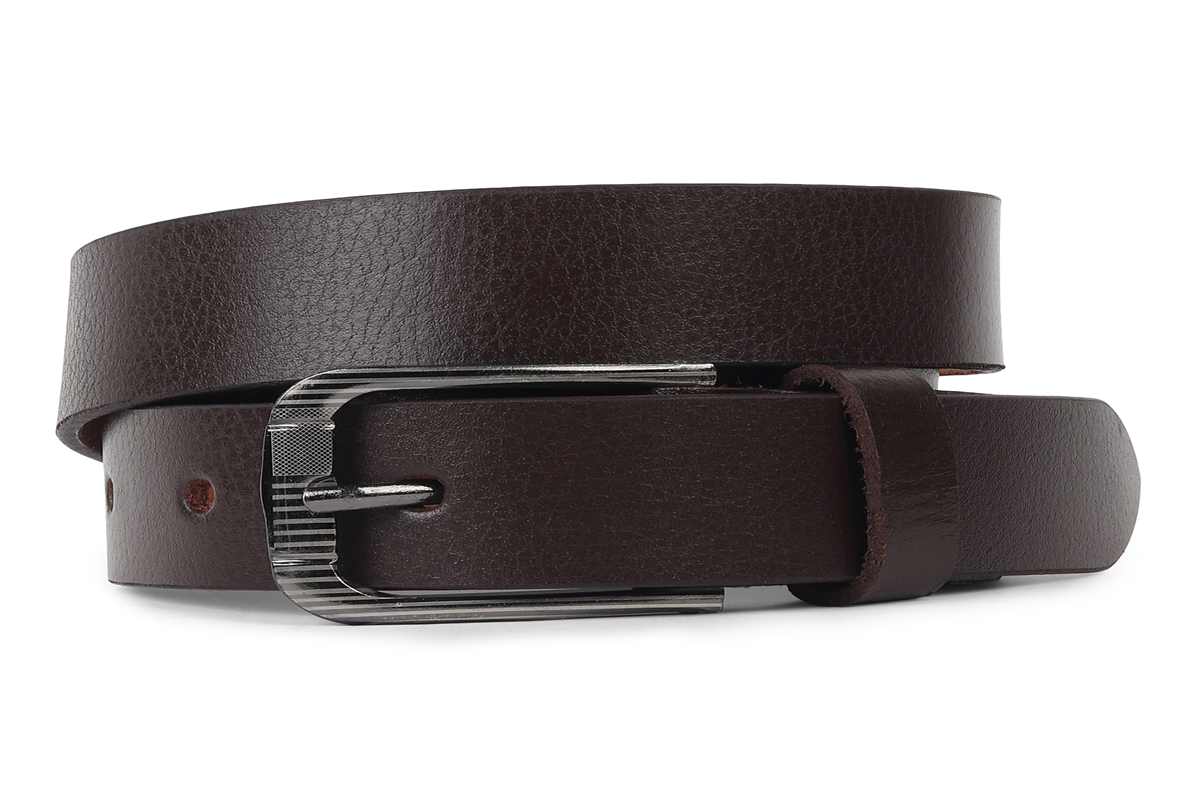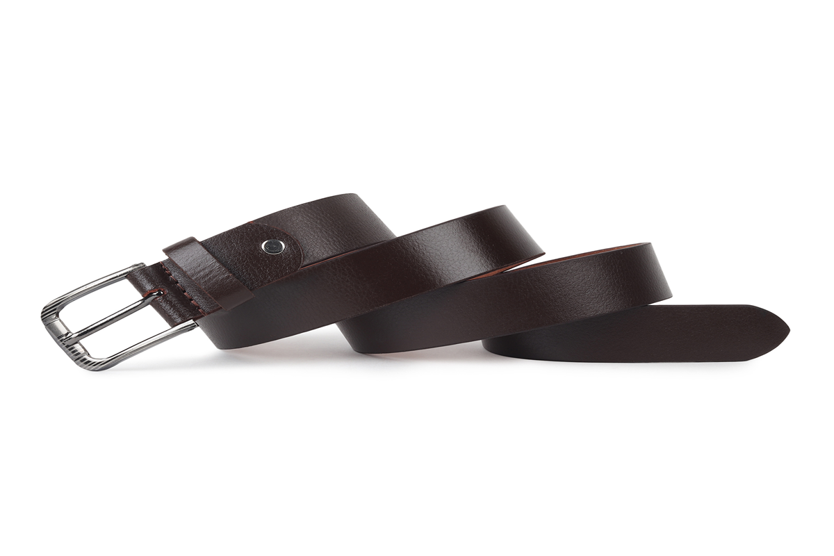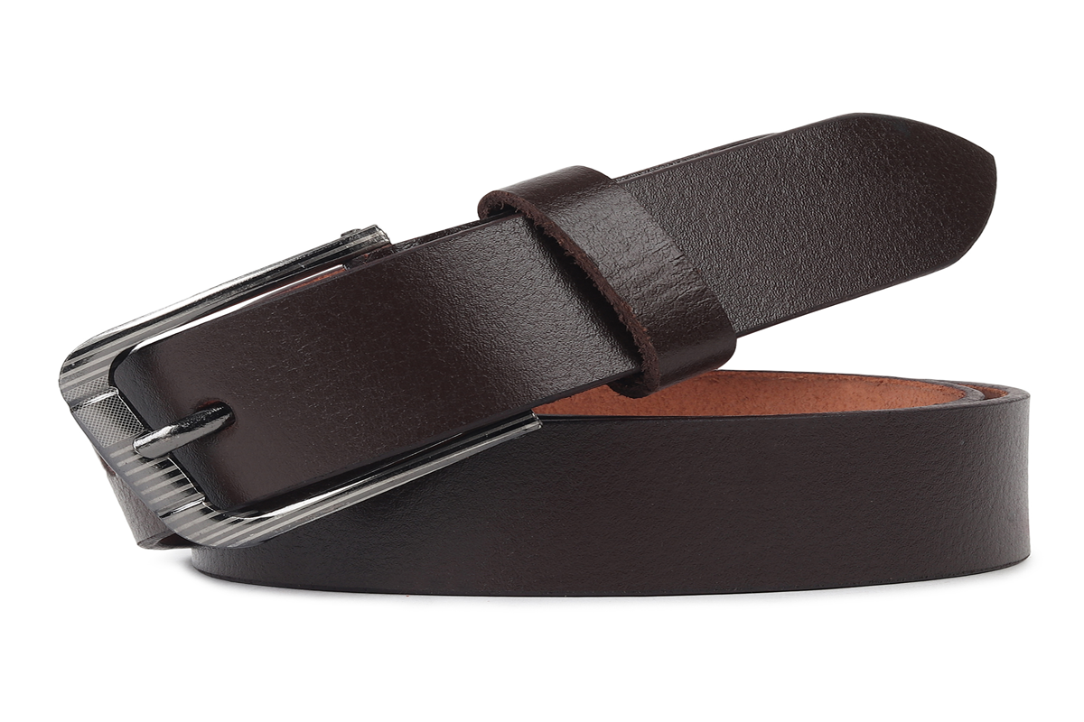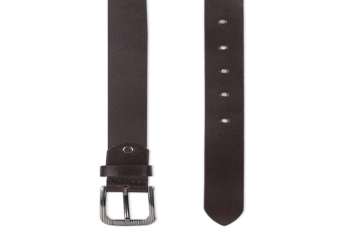 A premium dark brown leather belt crafted from thick, durable leather with a smooth outer finish and a natural tan suede underside. The belt features reinforced edge stitching for added strength and longevity, along with evenly spaced adjustment holes for a precise fit. It is fitted with a solid, silver-tone metal buckle with a single prong and a subtly textured surface, secured by a leather keeper and metal rivet. The robust construction and classic design make this belt ideal for everyday wear, casual outfits, and smart-casual looks, combining practicality with timeless style.