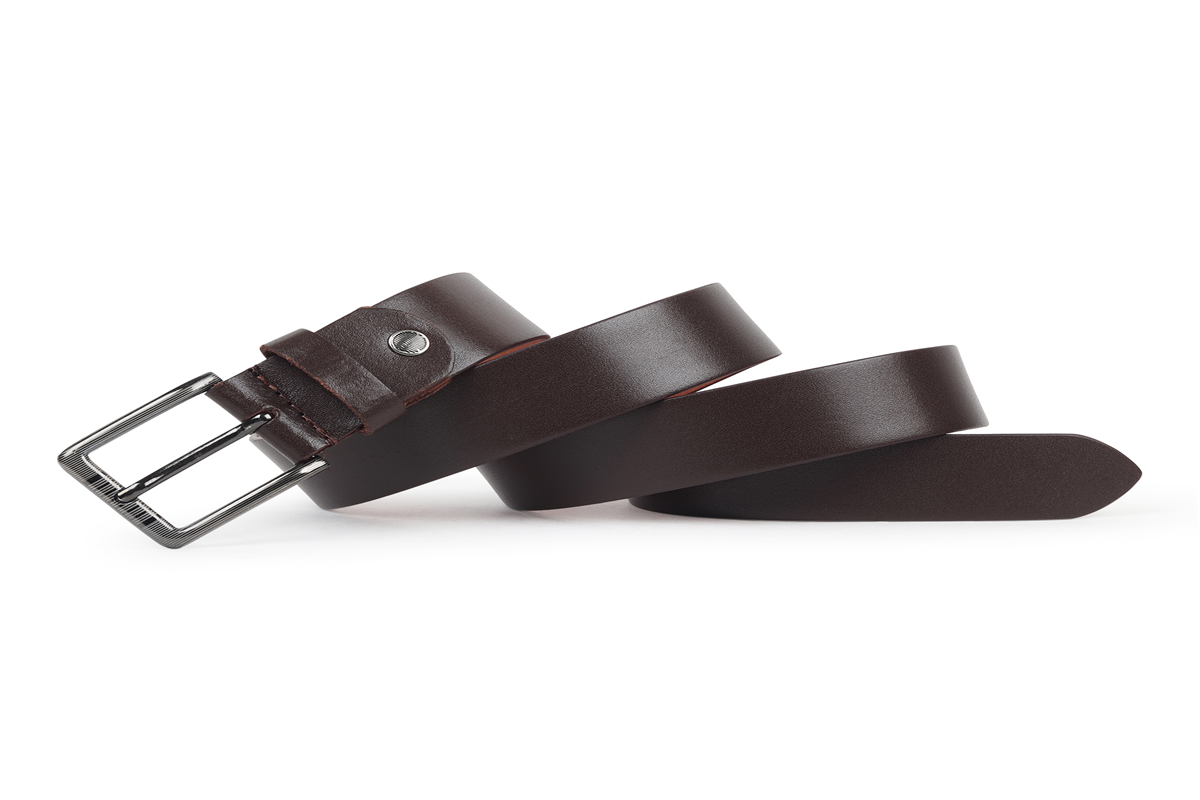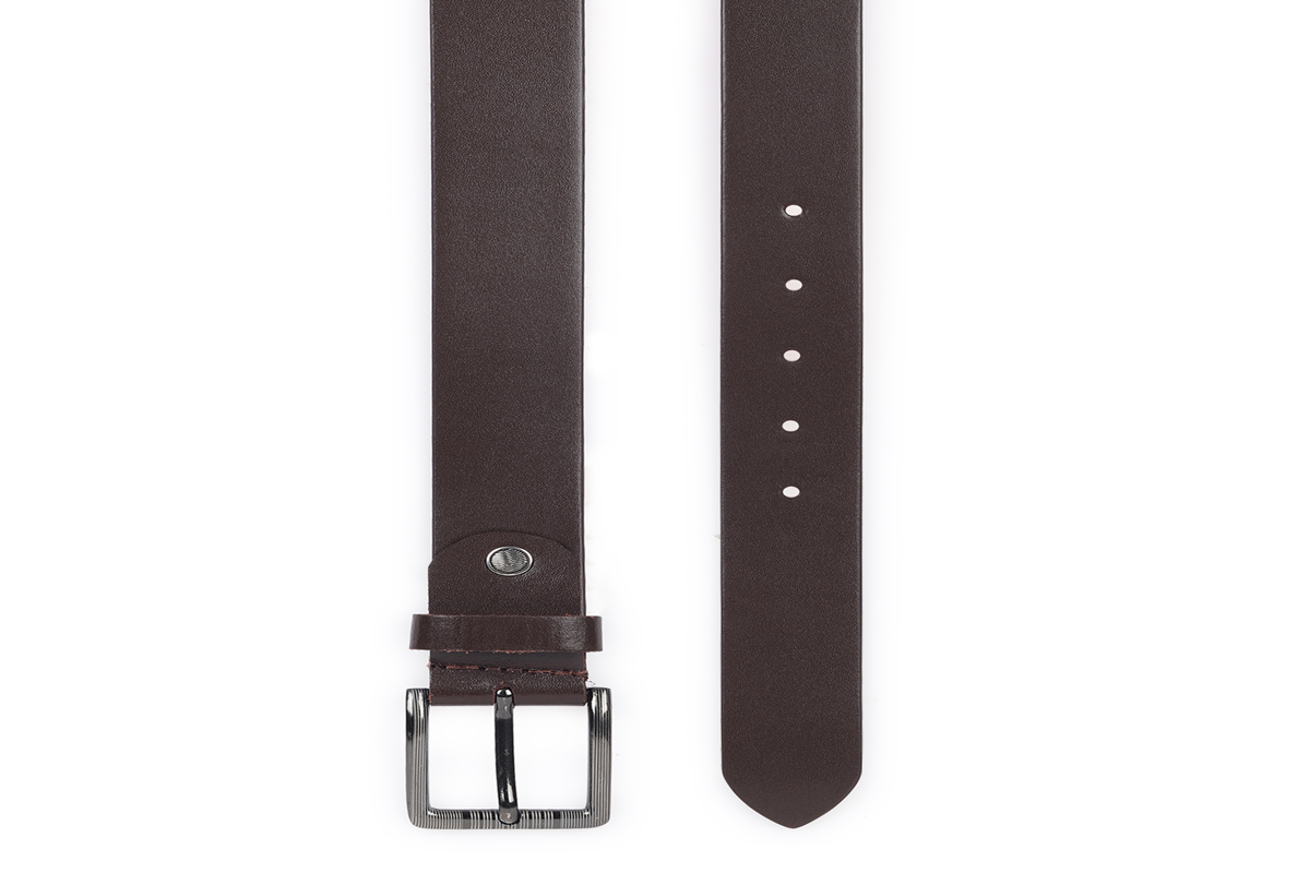 The image displays a dark brown leather belt laid flat and fully extended against a clean white background. The belt is made from smooth, high-quality leather with a fine, even grain and a matte finish, giving it a refined and understated appearance. On one end, it features a solid rectangular metal buckle in a dark silver or gunmetal tone, designed with a single prong for secure fastening. The buckle area is reinforced with neat stitching and a small metal rivet, adding both strength and a subtle decorative detail.